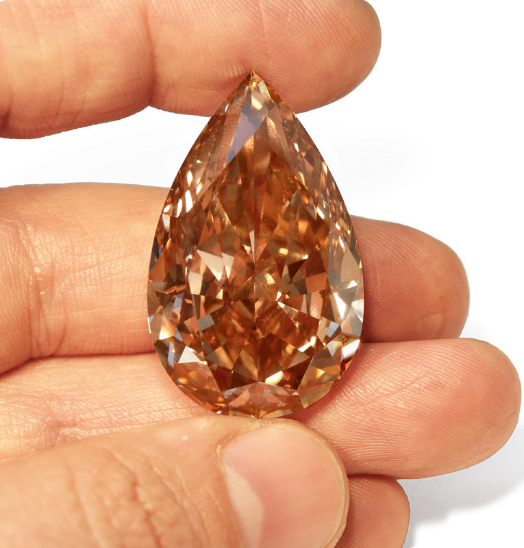 Staggering in size, exuberant in rich cognac color, this astonishing Pear Shape Diamond weighing over 80 carats is a magnificent spectacle of nature. A beautiful model pear shape outline, cut to perfection! Polished diamonds of this caliber in size and quality, especially in dominant orange hue, are rarely seen.