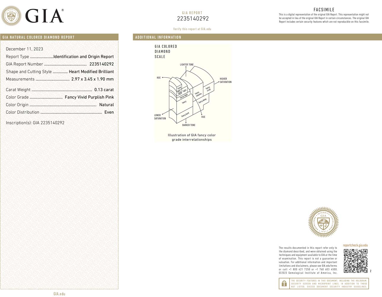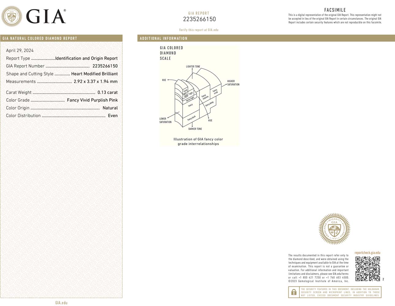 A sublime matching pair of gorgeous heart shape natural pink diamonds totaling 0.26 carats with supreme vivid colors, GIA certified - Fancy Vivid Purplish Pink with fine clarity and beautiful sparkle. A top level color among natural pink diamonds, very rare to see in matched pairs, would make for excellent accents to a fine jewelry piece.