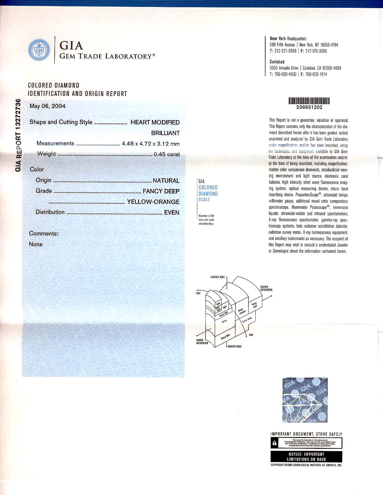 0.45 carat Heart Shape Fancy Deep Yellow-Orange GIA certfieid Diamond. Strong color orange diamond.