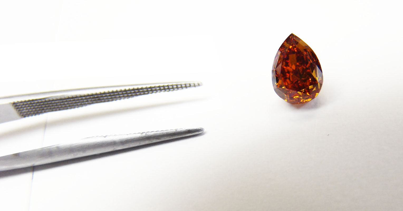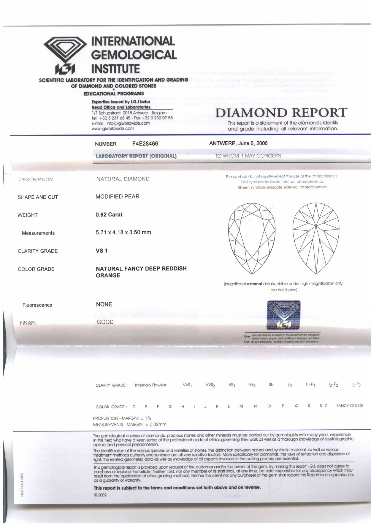 Extraordinary natural color .62 carat Pear Shape Deep color with combination of "Reddish" and Orange with VS1 clarity