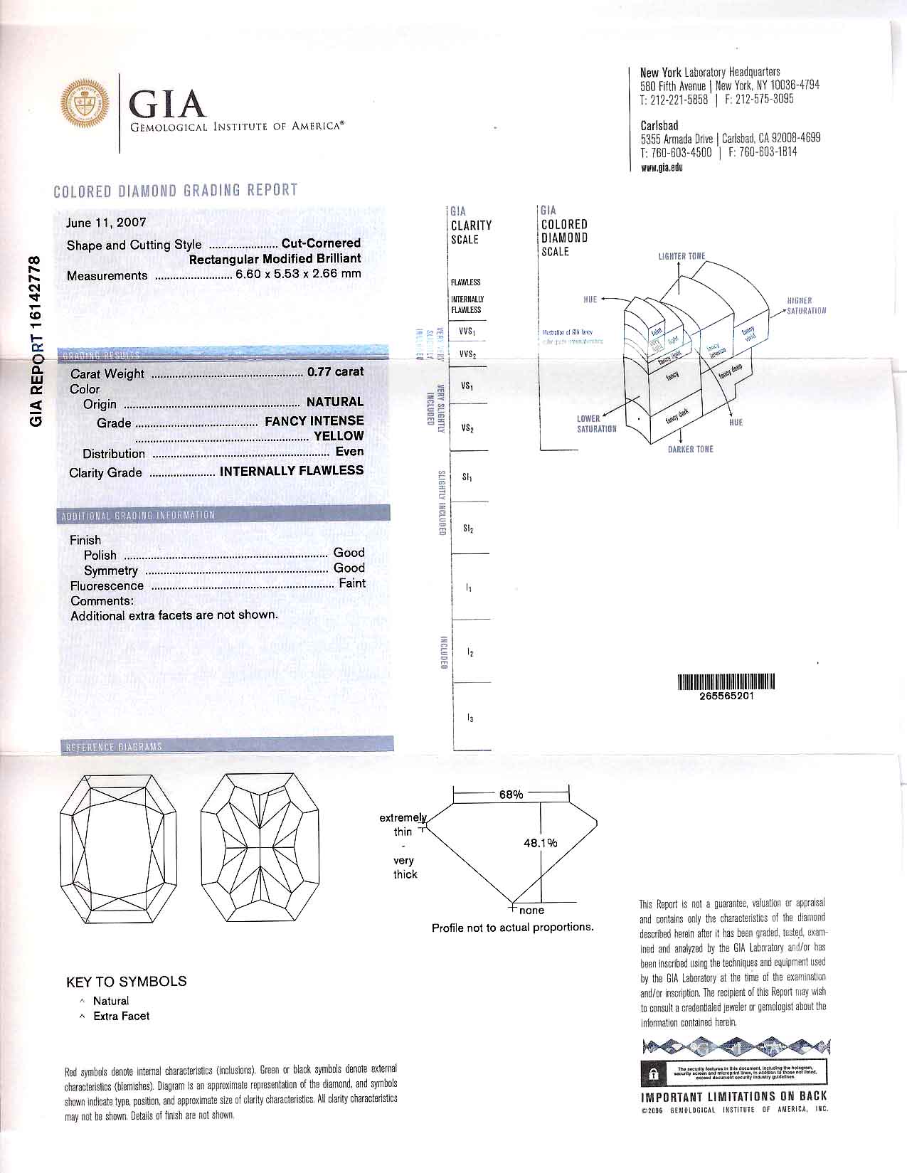 An incredible canary yellow diamond with a superb cut, high color saturation, and top clarity. 0.77ct Radiant GIA certified Fancy Intense Yellow Diamond with INTERNALLY FLAWLESS clarity grade. measurements that face up like a carat size! a gorgeous diamond full of brilliancy.