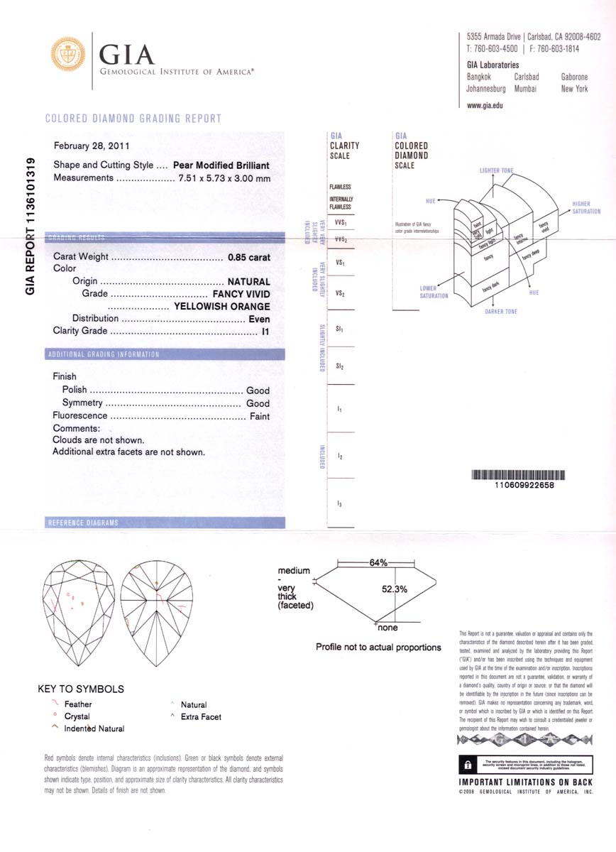 A remarkable and highly saturated orange diamond weighs 0.85 carats, GIA certified, Fancy VIVID Yellowish-Orange with the finest I1 clarity imaginable completely invisible to the naked eye and full of life. Beautifully cut Pear Shape has a fine spread and proportions like over one carat measurements. Very strong vivid color with a truly dominating orange appearance, close to a pure orange!