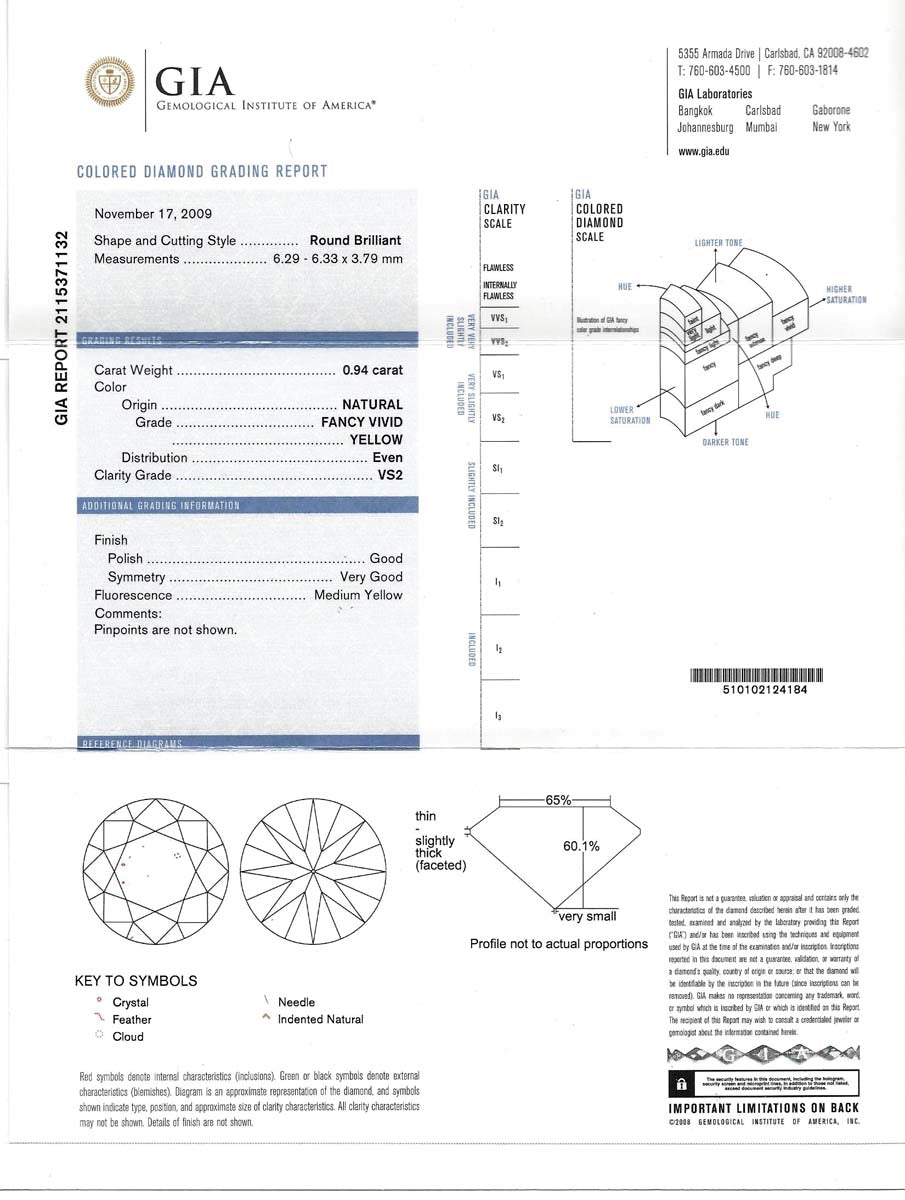 A rich and extremely vibrant Round Brilliant Cut diamond weighs 0.94 carats with awesome color intensity, GIA certified - Fancy Vivid Yellow, VS2 clarity. Beautifully proportioned in make, having a carat+ appearance in size and a wonderful display of color retained as a Round Brilliant with great clarity and sparkle.