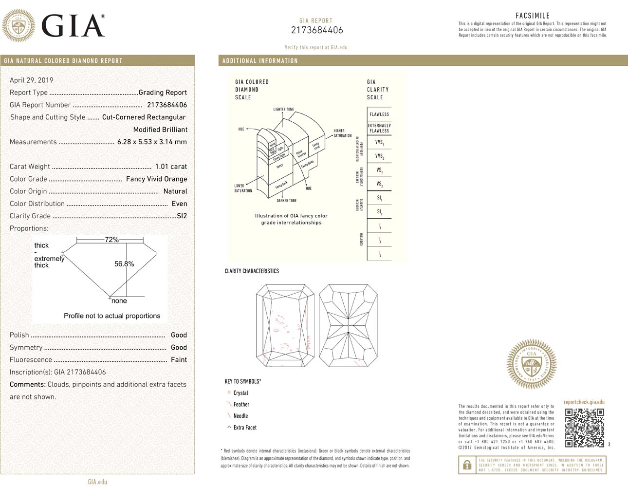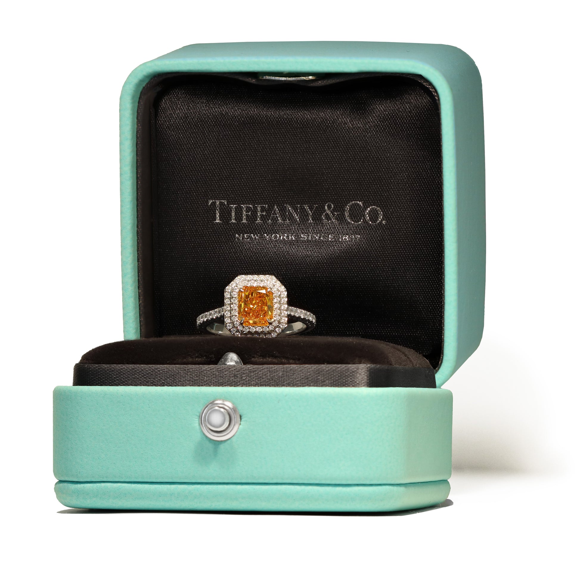 An extraordinary pumpkin diamond of unparalleled color manifested into a beautifully cut Radiant shape weighing 1.01 carats, GIA certified - FANCY VIVID ORANGE! A top level sensational VIVID in an absolute pure ORANGE color - One of the elite and highest regarded natural fancy color gradings by GIA standard. Virtually all orange diamonds fall into the sub-category of brownish and/or yellowish-orange. To attain a pure orange with no overtone color in the esteemed "vivid" category is one of the most spectacular natural achievements. This supreme color diamond is among the very few straight vivid oranges known to exist in the world over a carat size, with a fine and totally invisible SI2 clarity grade. Exceptional cutting disperses the color evenly throughout a beautiful spread make (56.8% depth), appearing larger than it’s weight. Mounted in Platinum by one of the most prestigious fine jewelry houses: Tiffany & Co. marked 68504376, with a double row of pave white diamonds highlighting the sheer vibrancy of orange saturation that is beyond compare. A very special and coveted item for a prime collector and true connoisseur of ultimate rare natural colored diamonds.