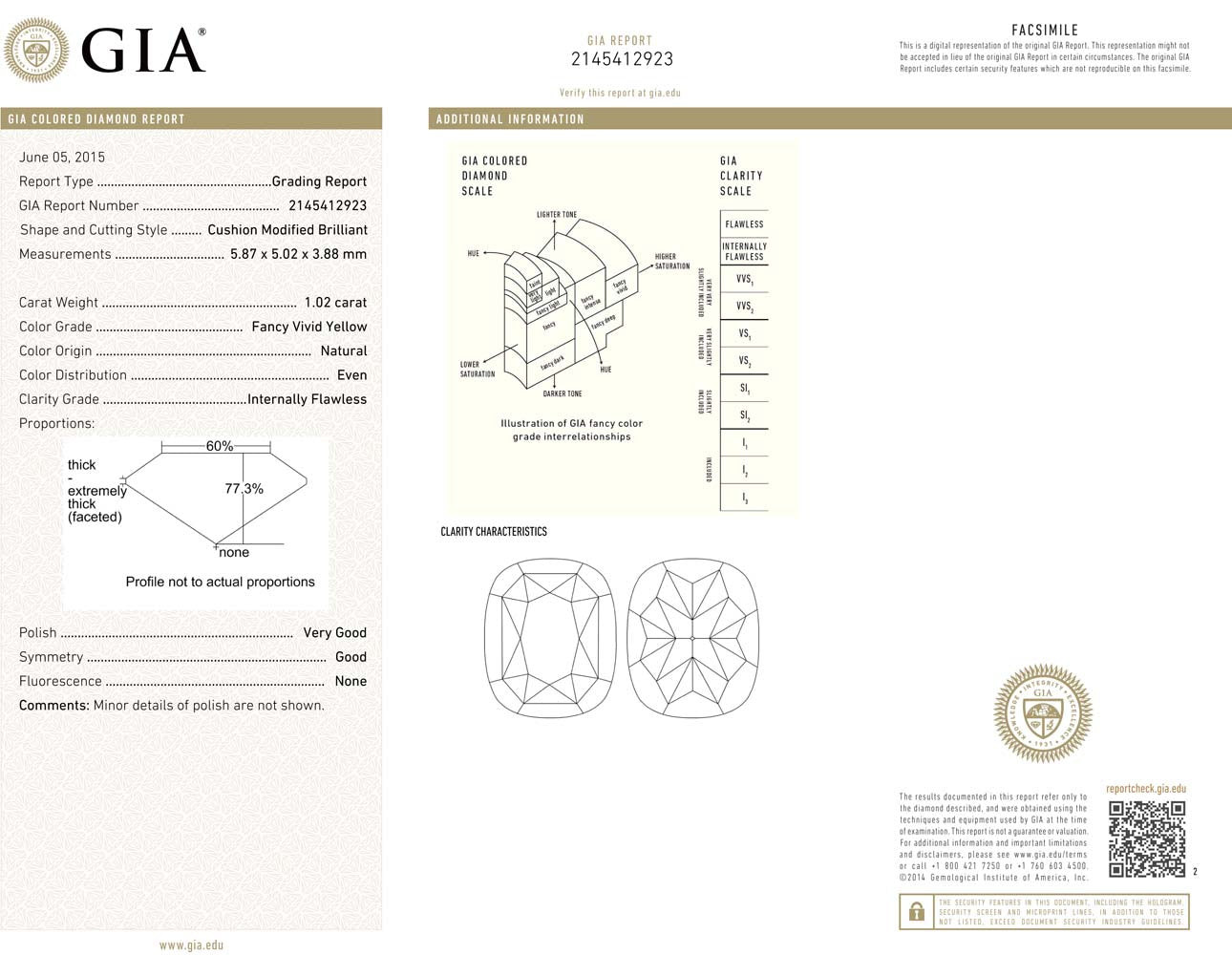 A fine canary yellow diamond weighs 1.02 carats with superb qualities. Cushion cut, GIA certified, Fancy VIVID Yellow - INTERNALLY FLAWLESS. A vibrant yellow color saturation with top color/clarity grade. The perfect yellow with the perfect clarity for the perfect canary diamond ring.