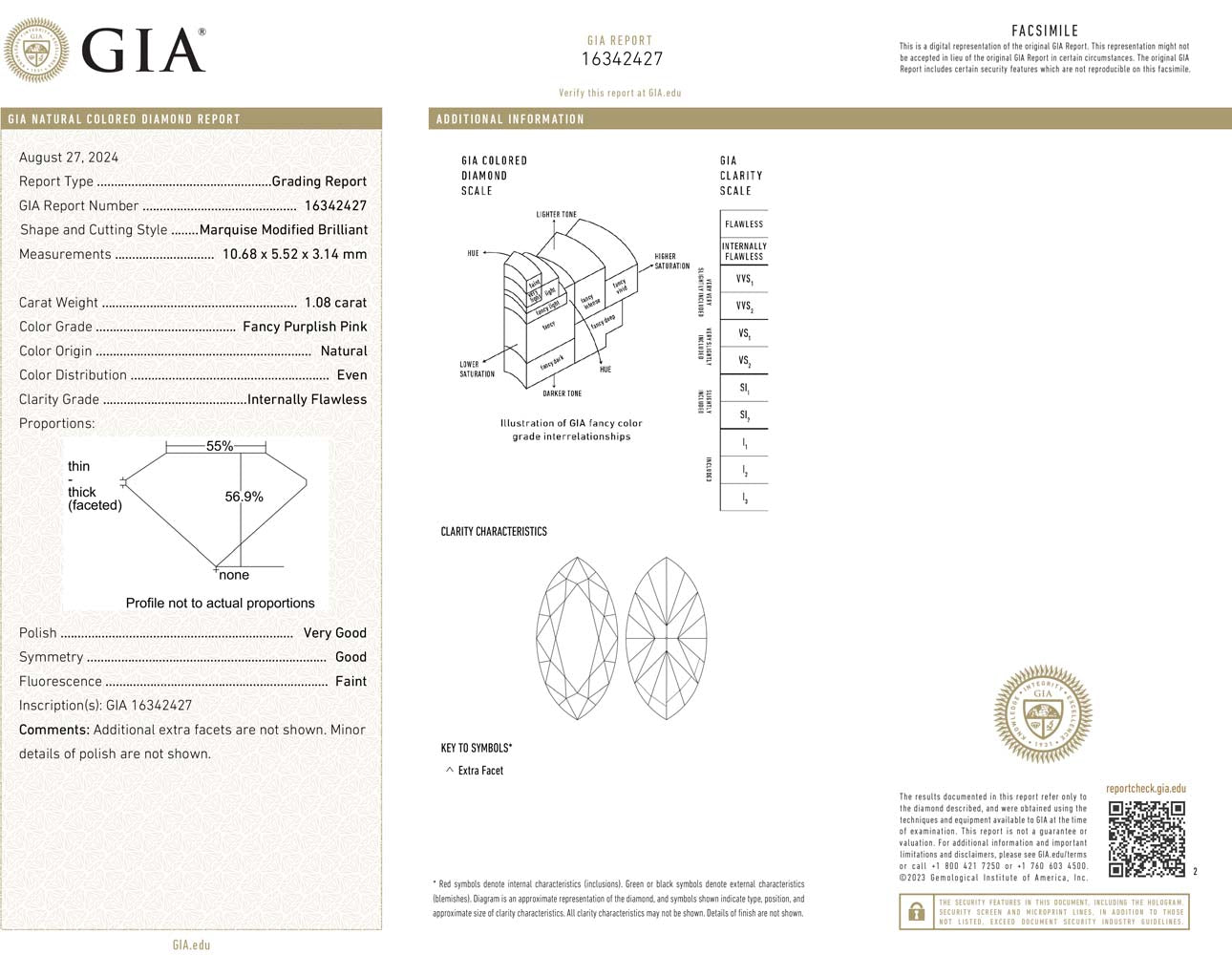 1.08ct Marquise, Fancy Purplish Pink Diamond, Flawless - GIA