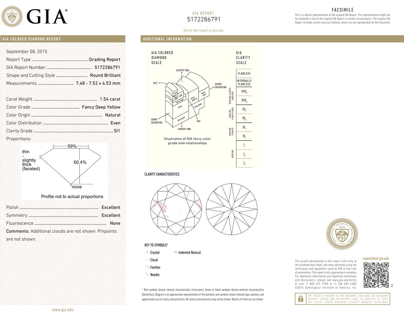 A spectacular color diamond with incredible vibrancy in a perfect make Round Brilliant weighing 1.54 carats, GIA certified - Fancy DEEP Yellow, SI1 clarity. A stone with scintillating fire exhibiting an extremely strong saturation of golden yellow bursting throughout. Wonderfully cut with Excellent/Excellent Polish & Symmetry not usually seen in fancy color.