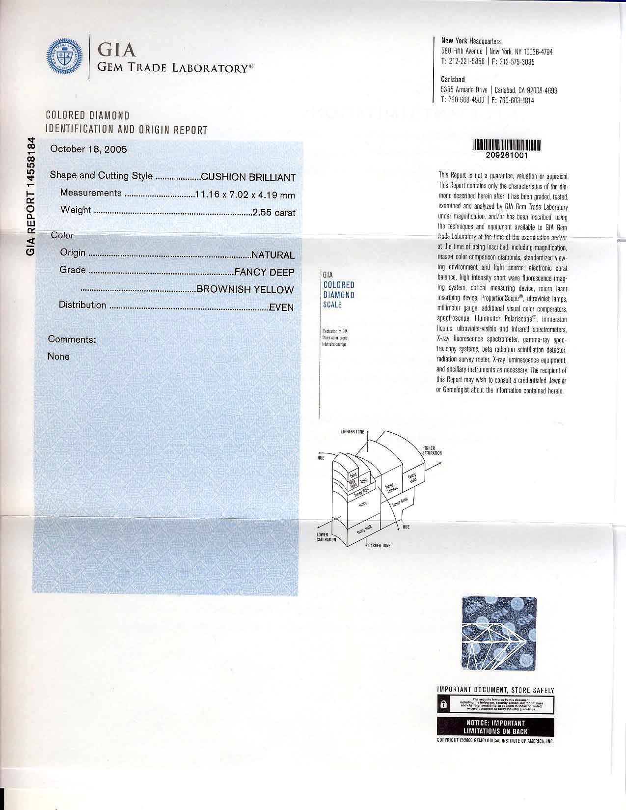 2.55 carat Cushion Fancy Deep brownish Yellow Diamond - GIA certified. Extravagant rich deep color with a fantastic spread.