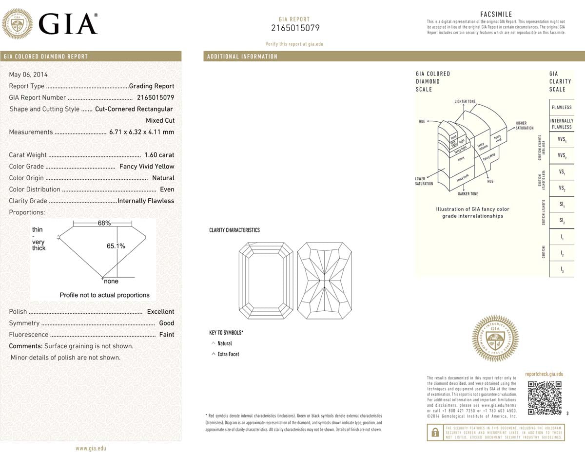 A canary diamond of supreme quality and exceptional color weighs 1.60 carat, GIA certified, Fancy VIVID Yellow - INTERNALLY FLAWLESS. A fine cut Radiant bursting with color saturation in a pure lemon yellow hue and perfect clarity. A great opportunity stone for those who seek the very best!