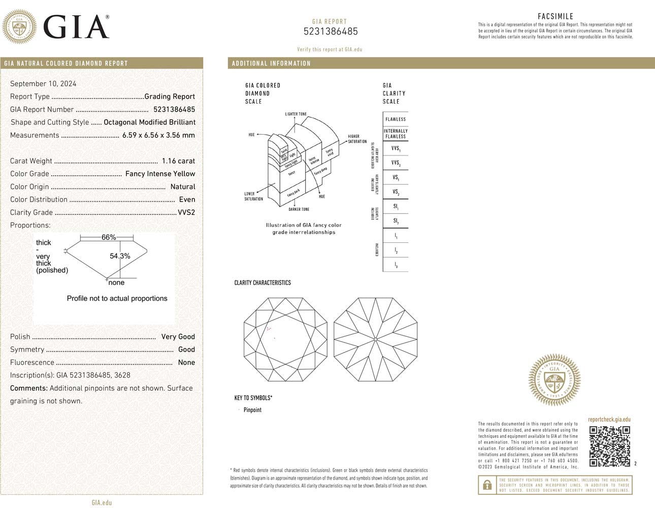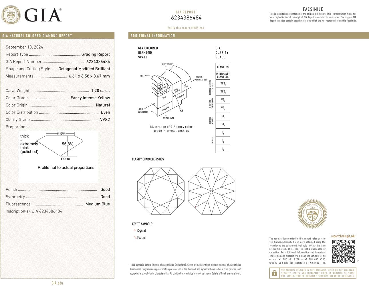A captivating and perfectly matched pair of vibrant Fancy Intense Yellow diamonds totaling 2.36 carats, GIA certified with high VVS2 clarities. Unique Octagonal Cuts with great saturation levels and very fine quality, ideal pair for beautiful canary yellow diamond stud earrings.