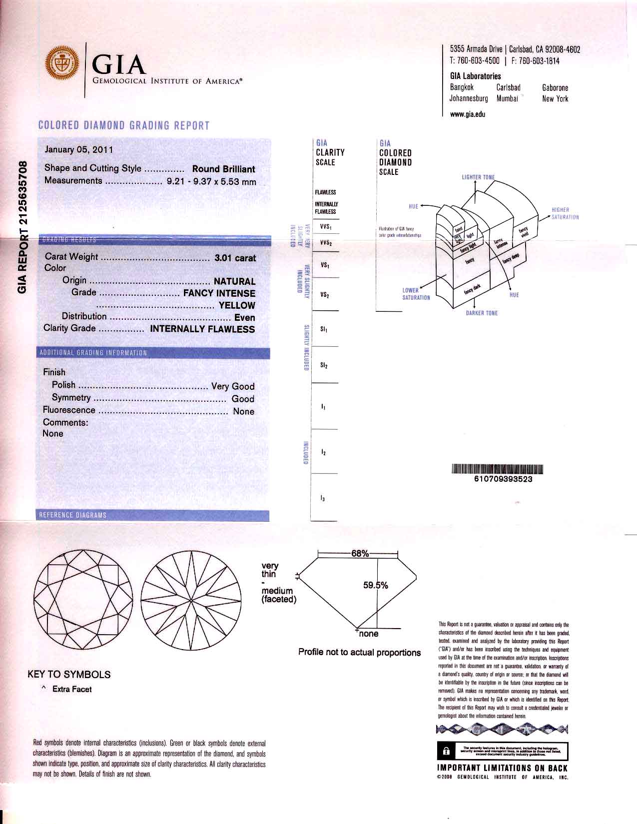 An incredibly rare ROUND BRILLIANT, Fancy INTENSE Yellow Diamond - GIA certified with INTERNALLY FLAWLESS clarity. Beautifully cut with 59.5% Depth, gorgeous color and perfect clarity. Very rare achievement to have this size, intensity, and clarity in a fine Round Brilliant Cut!