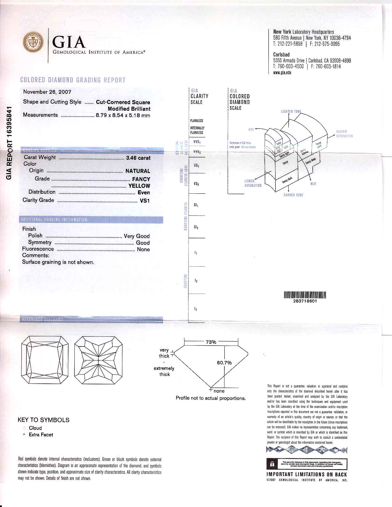 3.46 carat GIA certified Fancy Yellow with VS1 clarity. A well cut Radiant diamond with 60% depth and color borderline intense!
